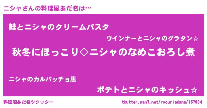 | 男性向けラノベタイトル風あだ名 | 『ニシャに滅ぼされるだけの簡単なお仕事です』 |