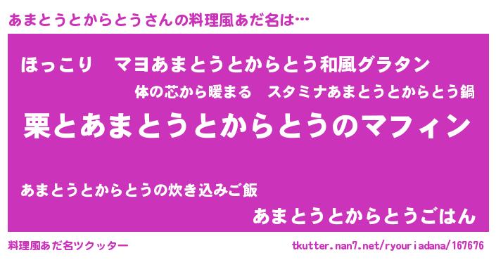 | 意味不明あだ名 | 『住所不定無職あまとうとからとう(86歳)』 |