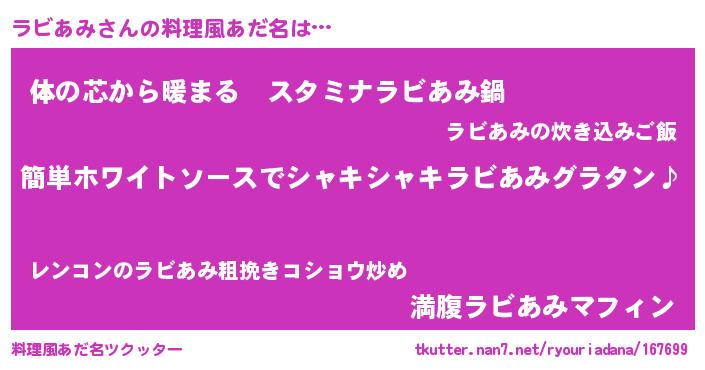 | 男性向けラノベタイトル風あだ名 | 『ラビあみの嫁は女の子じゃないと思った?』 |