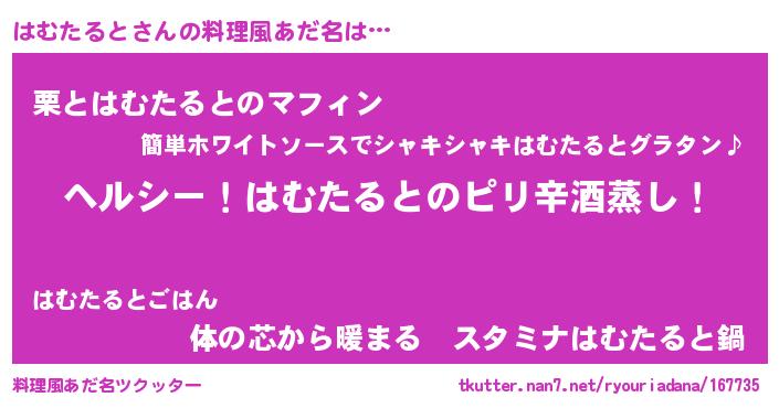 | 男性向けラノベタイトル風あだ名 | 『Re:はむたるとから始める異世界生活』 |
