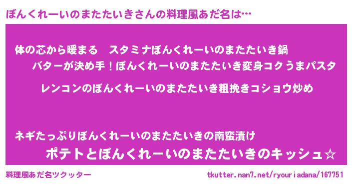 | 意味不明あだ名 | 『自称ぼんくれーいのまたたいき』 |