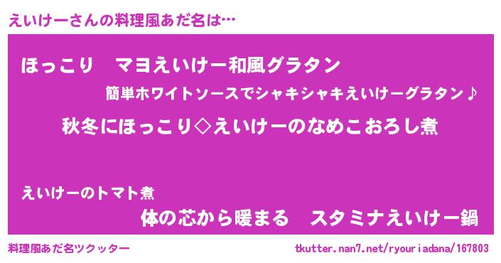 | 意味不明あだ名 | 『住所不定無職えいけー(85歳)』 |