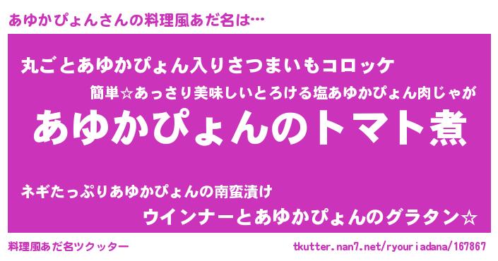 | 男性向けラノベタイトル風あだ名 | 『おまえをオタクにしてやるから、俺をあゆかぴょんにしてくれ! 』 |