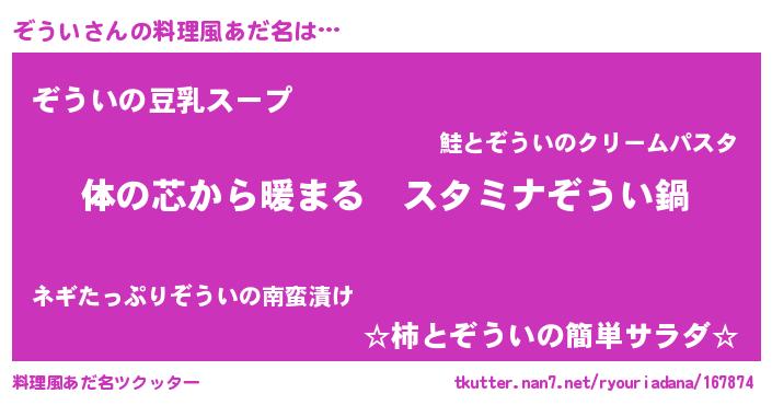 | 自動車の名前っぽいあだ名 | 『ゾクア』『ゾルトウパン』『ゾンR』 |