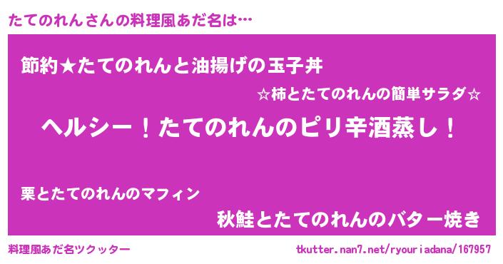 | 男性向けラノベタイトル風あだ名 | 『Re:たてのれんから始める異世界生活』 |