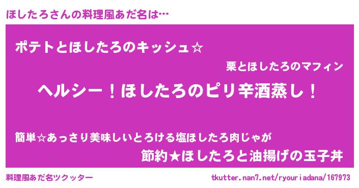| 男性向けラノベタイトル風あだ名 | 『Re:ほしたろから始める異世界生活』 |