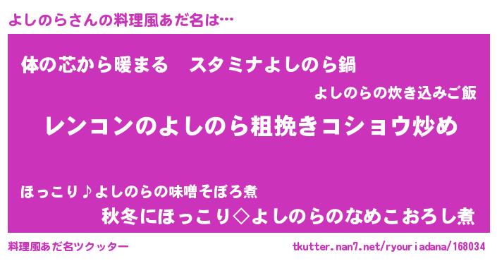 | 胡散臭い通販商品みたいなあだ名 | 『テレビで話題の高麗人参…その名も「よしのら」』 |