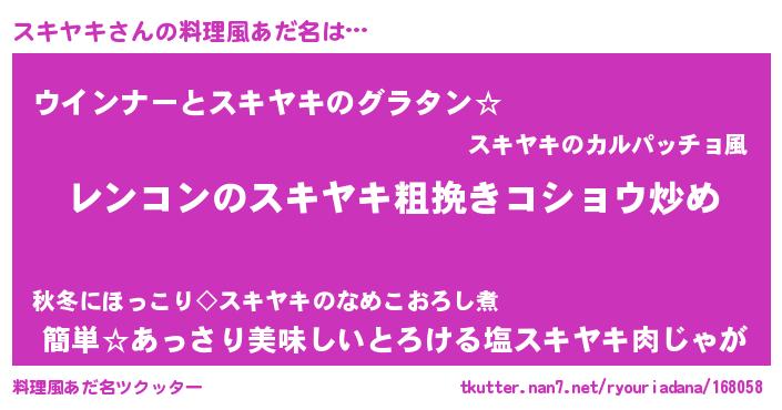 | 女子向けラノベタイトル風あだ名 | 『スキヤキなんてお断りですっ。』 |