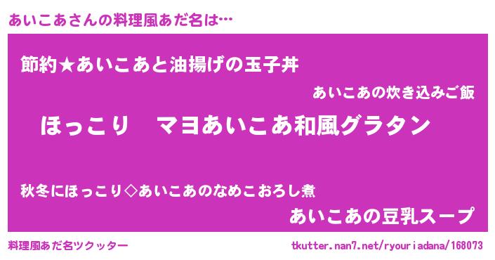 | 男性向けラノベタイトル風あだ名 | 『この素晴らしい世界にあいこあを!』 |