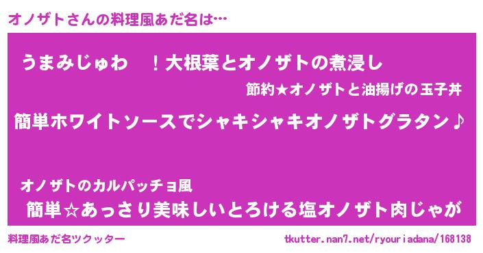 | 男性向けラノベタイトル風あだ名 | 『オノザトの嫁は女の子じゃないと思った?』 |