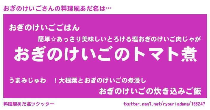 | 男性向けラノベタイトル風あだ名 | 『おまえをオタクにしてやるから、俺をおぎのけいごにしてくれ! 』 |