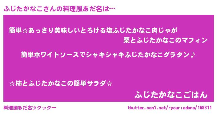 | 男性向けラノベタイトル風あだ名 | 『ふじたかなこの嫁は女の子じゃないと思った?』 |