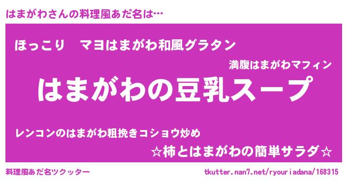 | 胡散臭い通販商品みたいなあだ名 | 『信頼と実績のサプリメント…その名も「はまがわ」』 |
