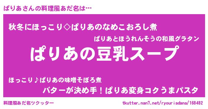 | 胡散臭い通販商品みたいなあだ名 | 『信頼と実績のサプリメント…その名も「ぱりあ」』 |