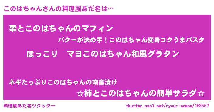 | 男性向けラノベタイトル風あだ名 | 『この素晴らしい世界にこのはちゃんを!』 |