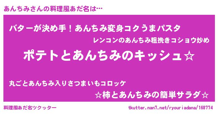| 男性向けラノベタイトル風あだ名 | 『あんちみの嫁は女の子じゃないと思った?』 |