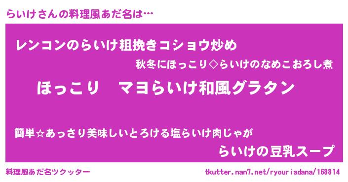 | ヘコむあだ名 | 『らいぷりん』『らいけ(笑)』『豆乳』 |