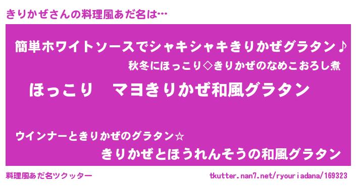 | 男性向けラノベタイトル風あだ名 | 『この素晴らしい世界にきりかぜを!』 |