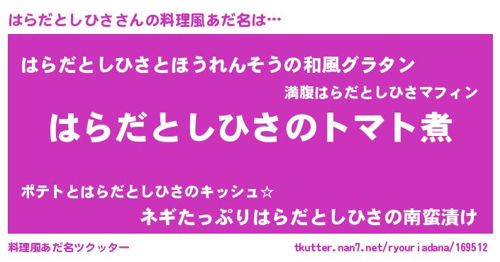 | 男性向けラノベタイトル風あだ名 | 『おまえをオタクにしてやるから、俺をはらだとしひさにしてくれ! 』 |