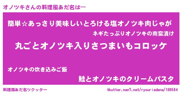 | 女子向けラノベタイトル風あだ名 | 『乙女ゲームの破滅フラグしかない悪役オノツキに転生してしまった…』 |