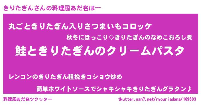 | 男性向けラノベタイトル風あだ名 | 『ノーゲーム・ノーキリタギン』 |