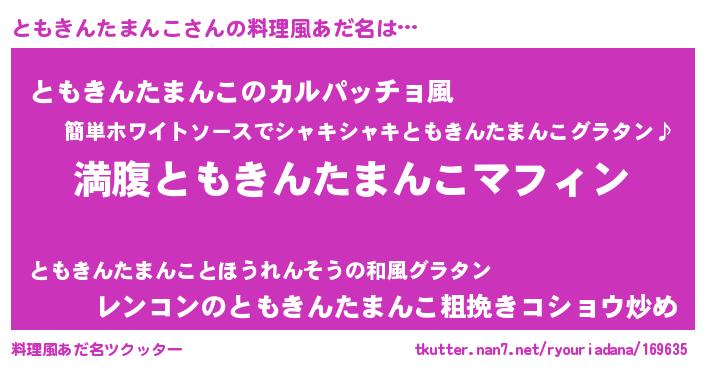 | 男性向けラノベタイトル風あだ名 | 『ともきんたまんこという概念が存在しない退屈な世界 』 |