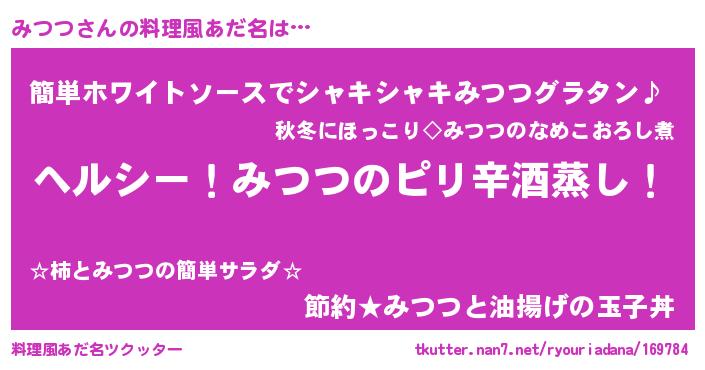 | 胡散臭い通販商品みたいなあだ名 | 『テレビで話題のアガリクス…その名も「みつつ」』 |