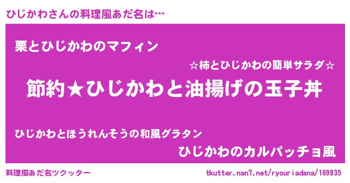 | 男性向けラノベタイトル風あだ名 | 『ひじかわの憂鬱』『魔弾の王とひじかわ』 |