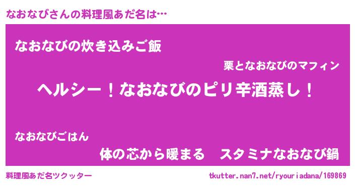 | 男性向けラノベタイトル風あだ名 | 『Re:なおなびから始める異世界生活』 |