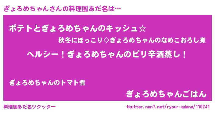 | 男性向けラノベタイトル風あだ名 | 『Re:ぎょろめちゃんから始める異世界生活』 |