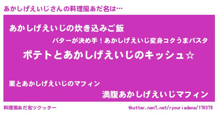 | 女子向けラノベタイトル風あだ名 | 『あかしげえいじの卵を拾いまして』 |