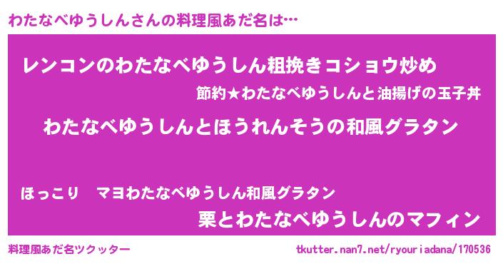 | 男性向けラノベタイトル風あだ名 | 『転生したらわたなべゆうしんだった件』 |