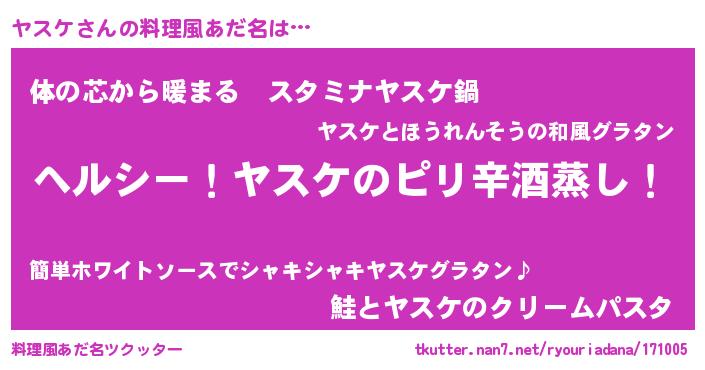 | 女子向けラノベタイトル風あだ名 | 『闇のヤスケ』『ヤスケの雑貨屋さん』 |