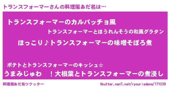 女子向けラノベタイトル風あだ名 | 『(仮)トランスフォーマーのやんごとなき事情』 |
