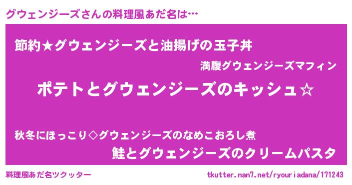 | 男性向けラノベタイトル風あだ名 | 『ダンジョンにグウェンジーズを求めるのは間違っているだろうか』 |