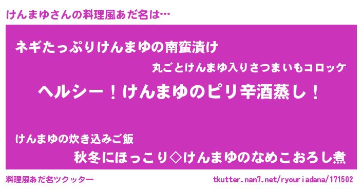 | 男性向けラノベタイトル風あだ名 | 『Re:けんまゆから始める異世界生活』 |