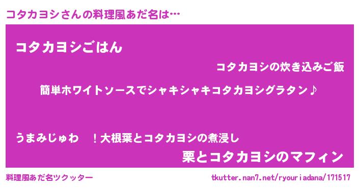 | 女子向けラノベタイトル風あだ名 | 『コタカヨシ様がみてる』 |