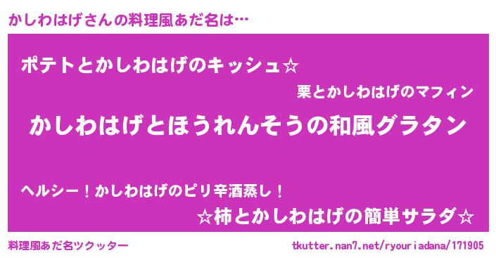 | 男性向けラノベタイトル風あだ名 | 『かしわはげ~年齢イコール彼女いない歴の魔法使い~』 |
