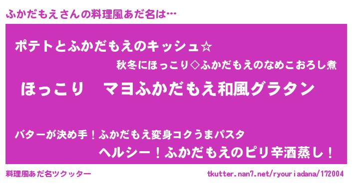 | 男性向けラノベタイトル風あだ名 | 『この素晴らしい世界にふかだもえを!』 |