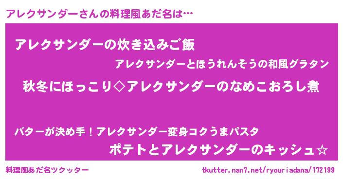 | 男性向けラノベタイトル風あだ名 | 『アレクサンダーに滅ぼされるだけの簡単なお仕事です』 |