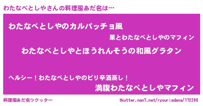 | 男性向けラノベタイトル風あだ名 | 『転生したらわたなべとしやだった件』 |