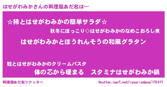 | 男性向けラノベタイトル風あだ名 | 『はせがわみか~年齢イコール彼女いない歴の魔法使い~』 |