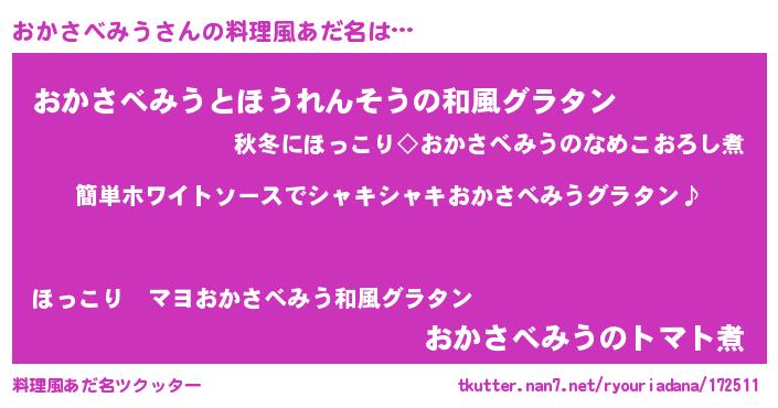 | 男性向けラノベタイトル風あだ名 | 『おかさべみうの嫁は女の子じゃないと思った?』 |