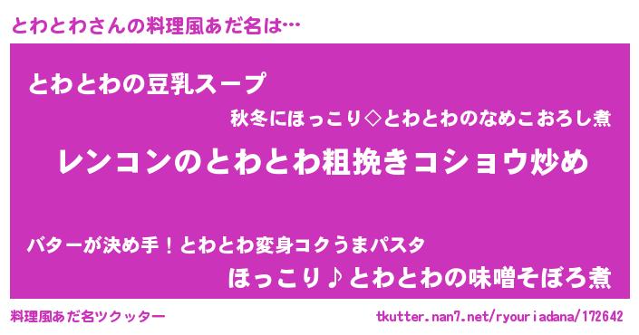 | 意味不明あだ名 | 『自称とわとわ』『ペロリンとわとわ』 |