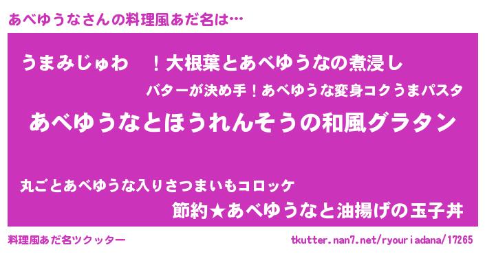 | 女子向けラノベタイトル風あだ名 | 『あべゆうなの玉の輿計画!』 |