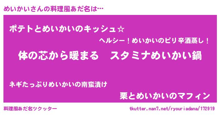 | 意味不明あだ名 | 『めいかいフォーエバー』『自称めいかい』 |