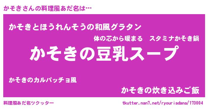 | ヘコむあだ名 | 『かそを』『なまこ酢』『かそもー』 |