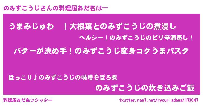 | 男性向けラノベタイトル風あだ名 | 『ノーゲーム・ノーノミズコウジ』 |