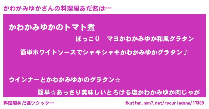 | 男性向けラノベタイトル風あだ名 | 『かわかみゆかの嫁は女の子じゃないと思った?』 |