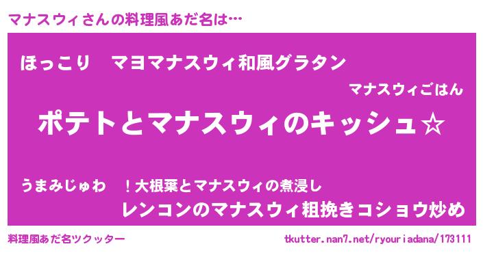 | ヘコむあだ名 | 『マナ太郎』『なまこ酢』『マナにー』 |